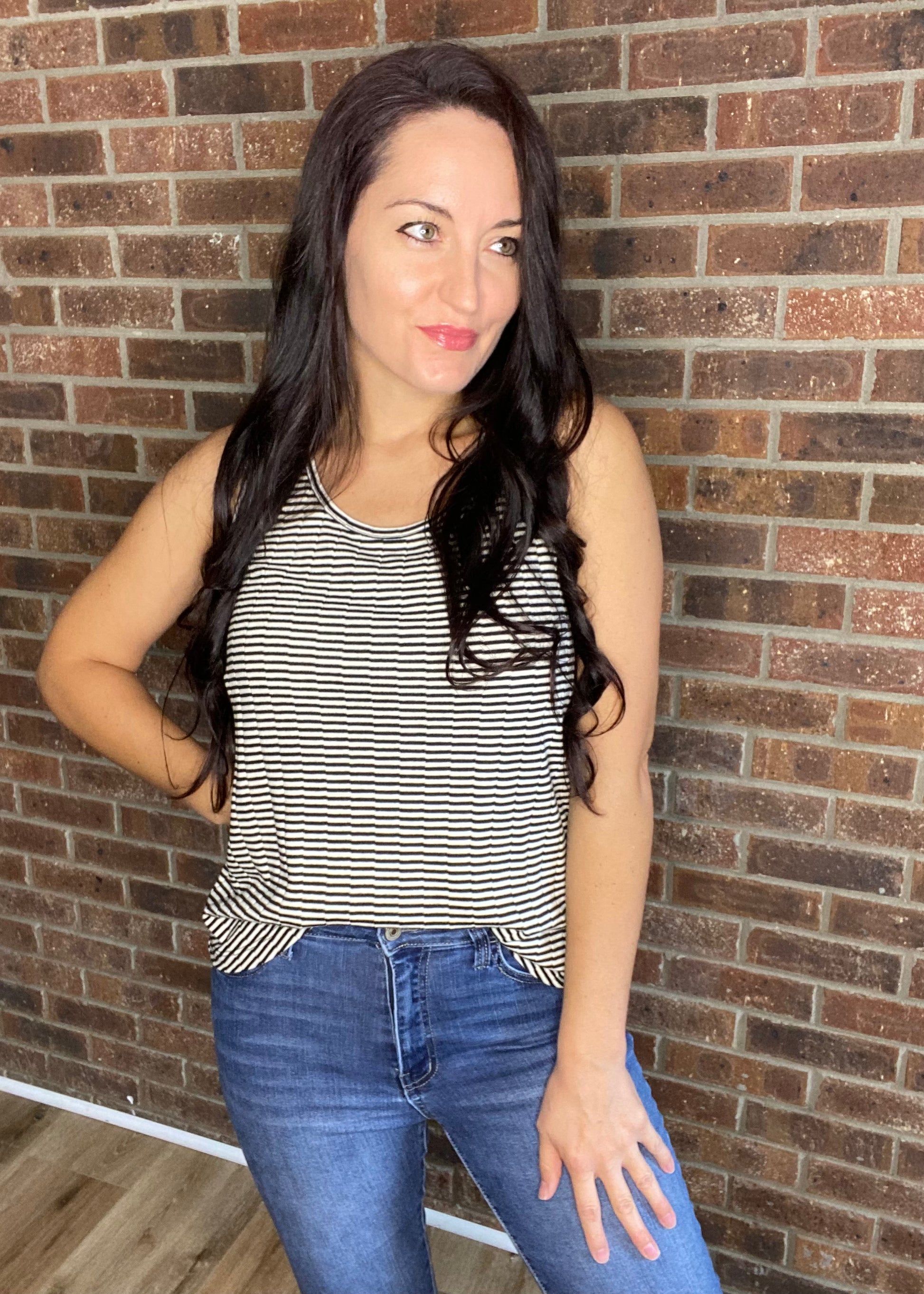 You can't go wrong with this Classic Striped Scoop Neck Tank - it's the perfect tank to match with any color bottom! Front tuck & go! Love the feel of the fabric, as it's got vertically textured stripes to elevate the quality & style. Features wide enough sleeves to cover your bra straps, so no worries!