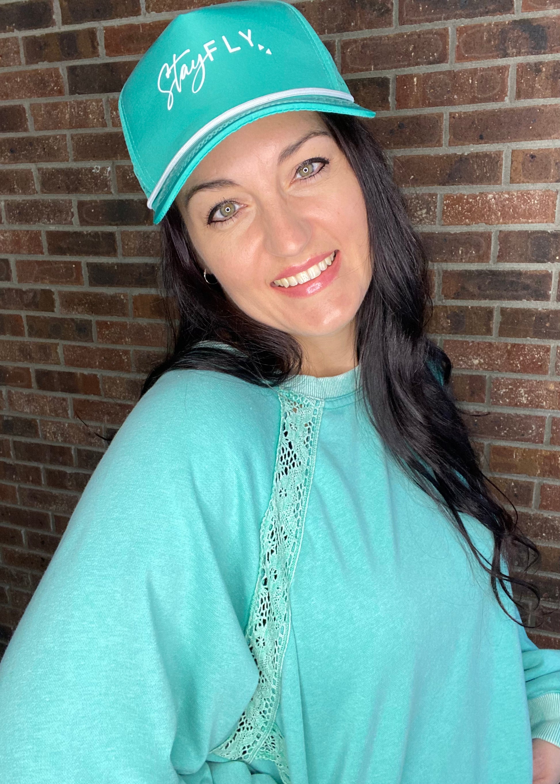 STAY FLY! With its breathable design, this hat will keep you comfortable and cool all day long. Plus, the ponytail feature allows for easy styling and versatile wear. STAY FLY and stay on top of your game with this must-have turquoise cap!