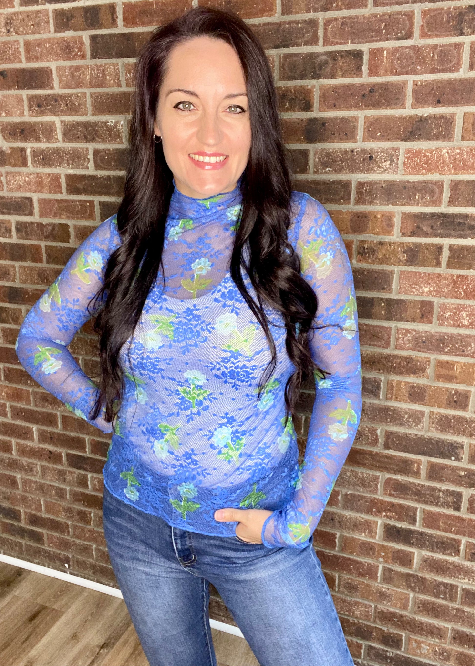 Umgee Bloom Mesh Floral Lace Top - Ocean Blue
