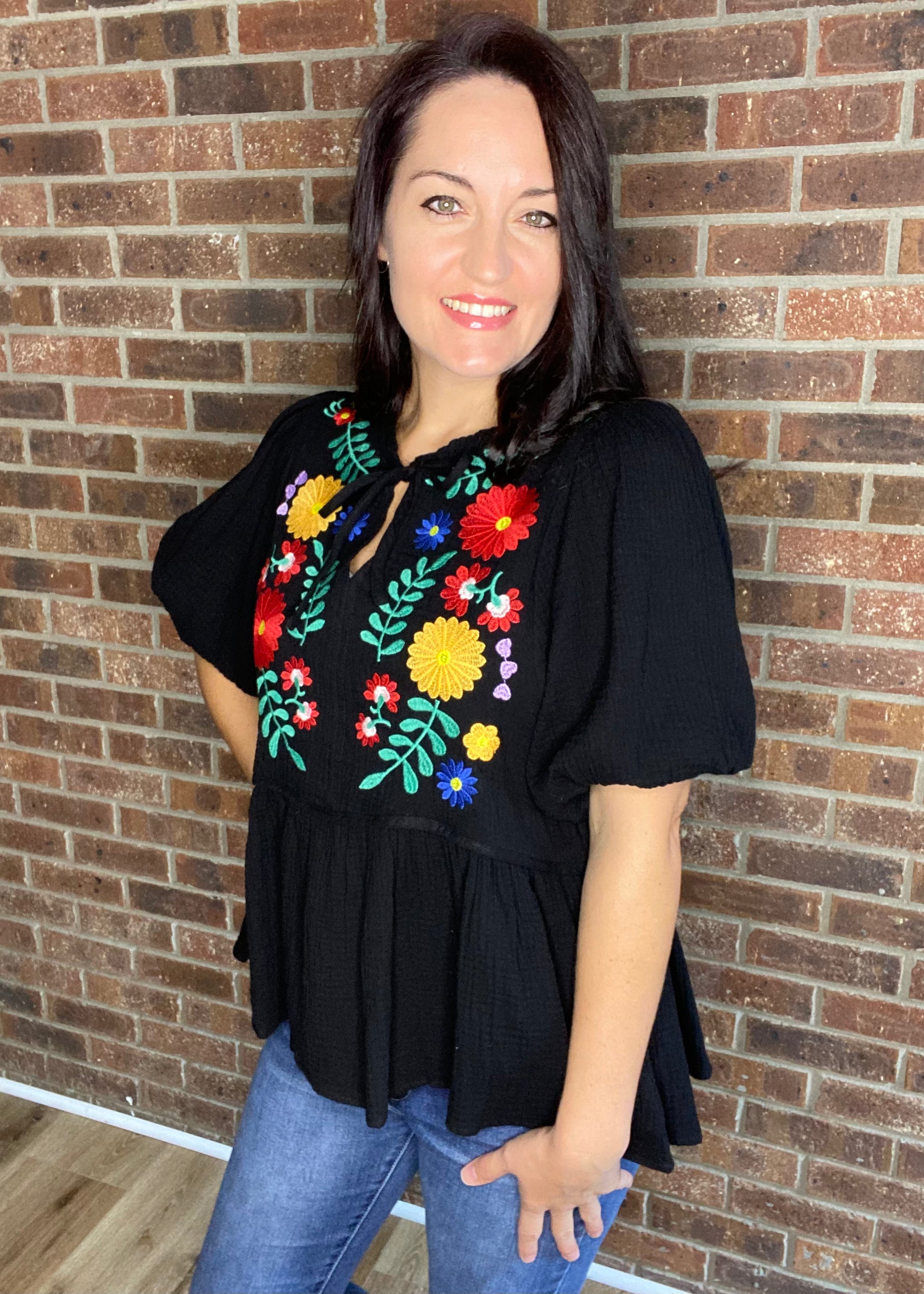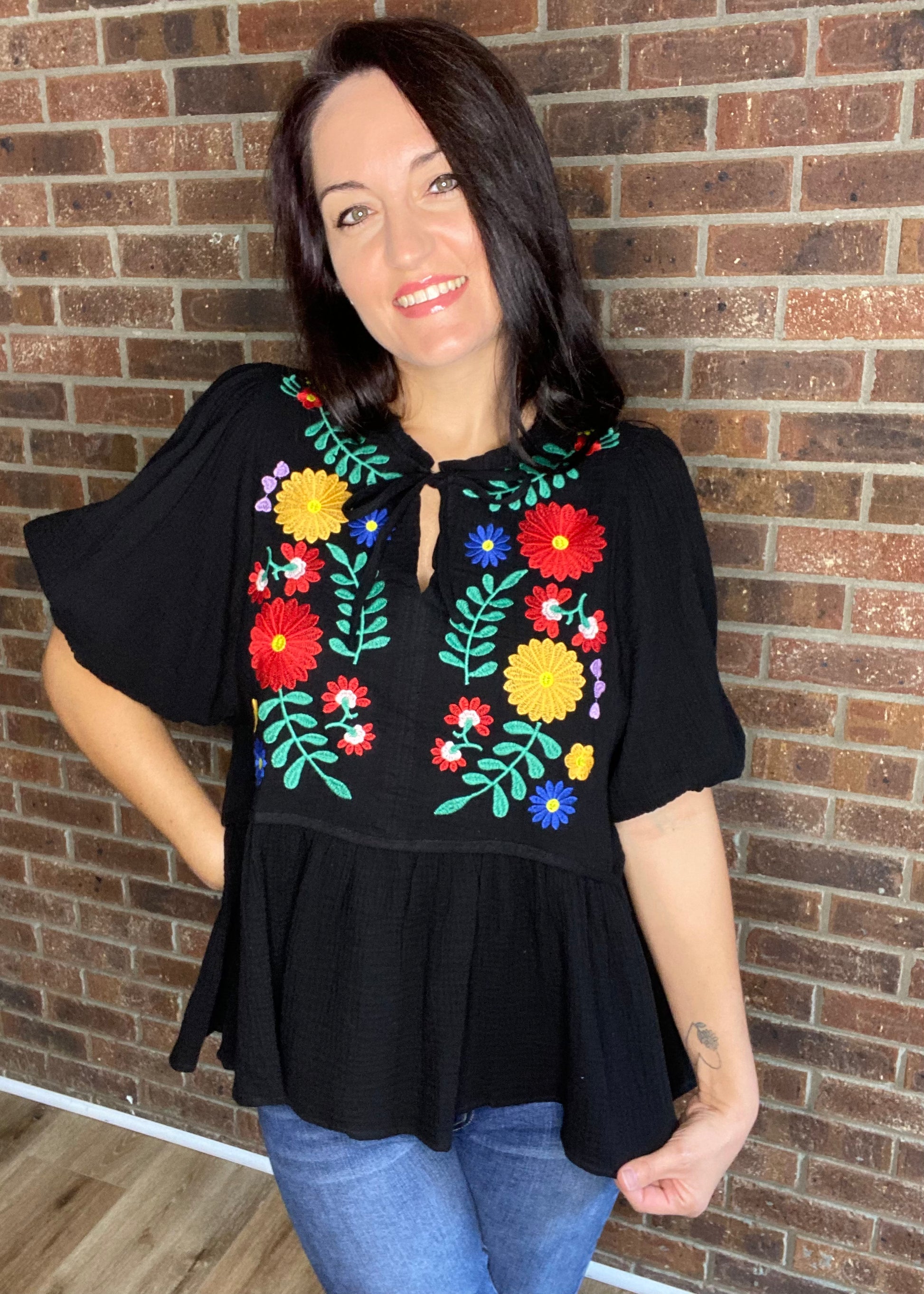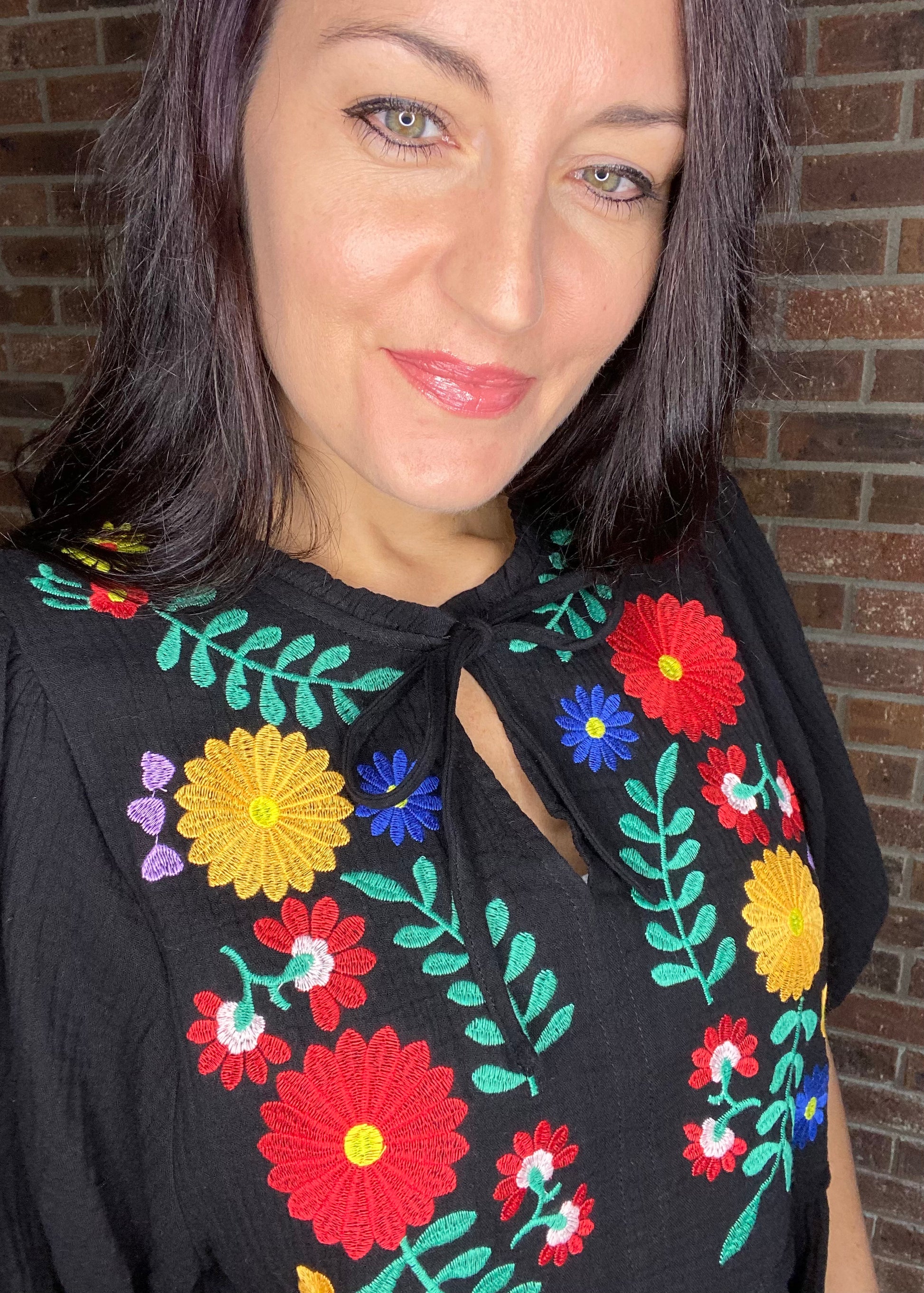 "STUNNING" is the word you're looking for! The embroidery on this Umgee top is stunning, especially how the colors pop against the black. Enjoy 100% cotton gauze material with a flowy babydoll style design & optional tie drawstring.